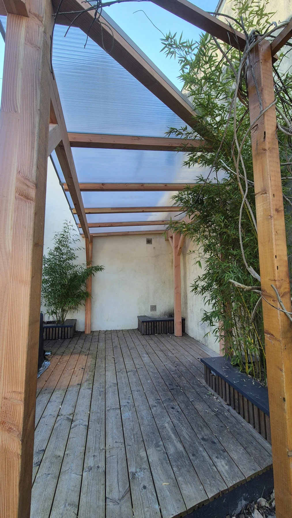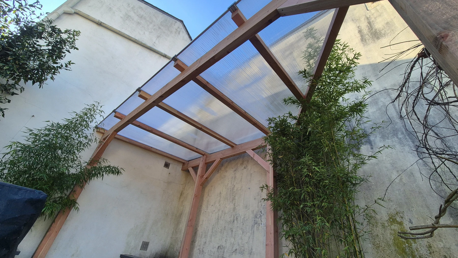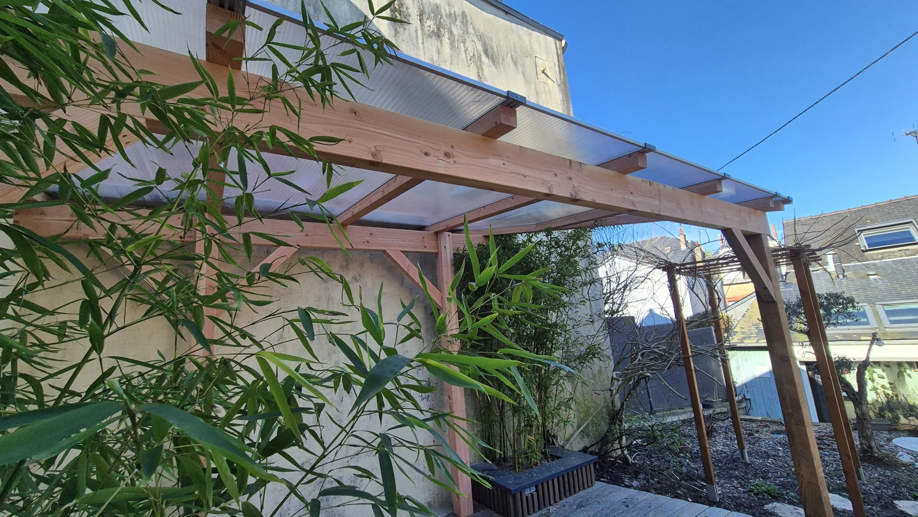 Réalisation d'une pergolas en bois douglas et couverture en Tôle polycarbonate pour une étanchéité parfaite et en profité même sous la pluie,